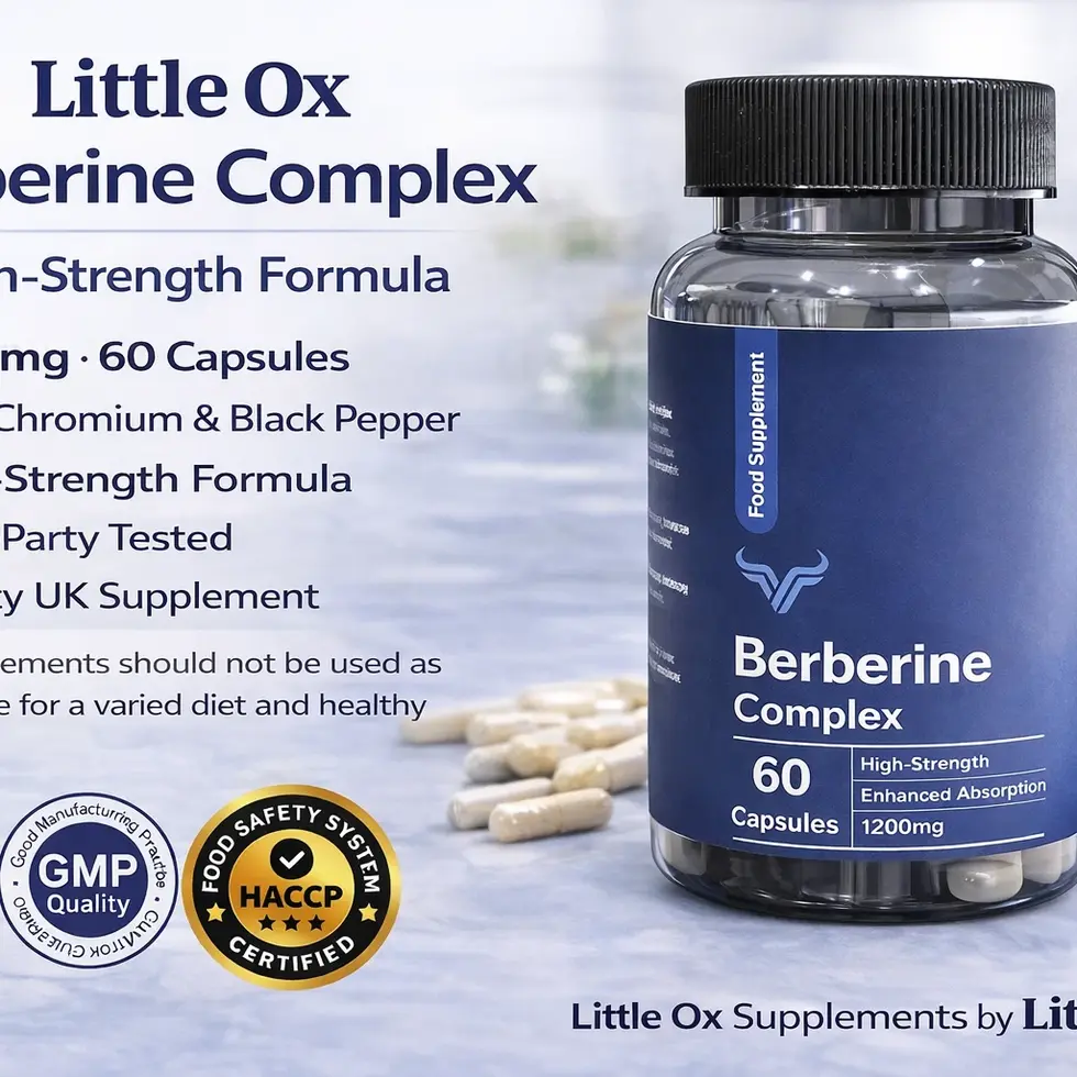 Little Ox Berberine Complex is a high-strength, expertly balanced formula designed for those who value ingredient quality, thoughtful formulation, and manufacturing integrity. Each serving delivers 1200mg of berberine hydrochloride, enhanced with chromium picolinate and black pepper extract, in convenient capsules for effortless daily use.